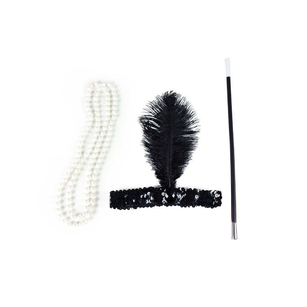 Elegantná sada pre tanečnice Charleston je perfektná na retro vystúpenia, karneval či tematické párty v štýle 20. rokov. Dodá outfitu štýl a šmrnc. Set obsahuje čelenku s perím, korále a cigaretovú špičku.Dodatočné parametre