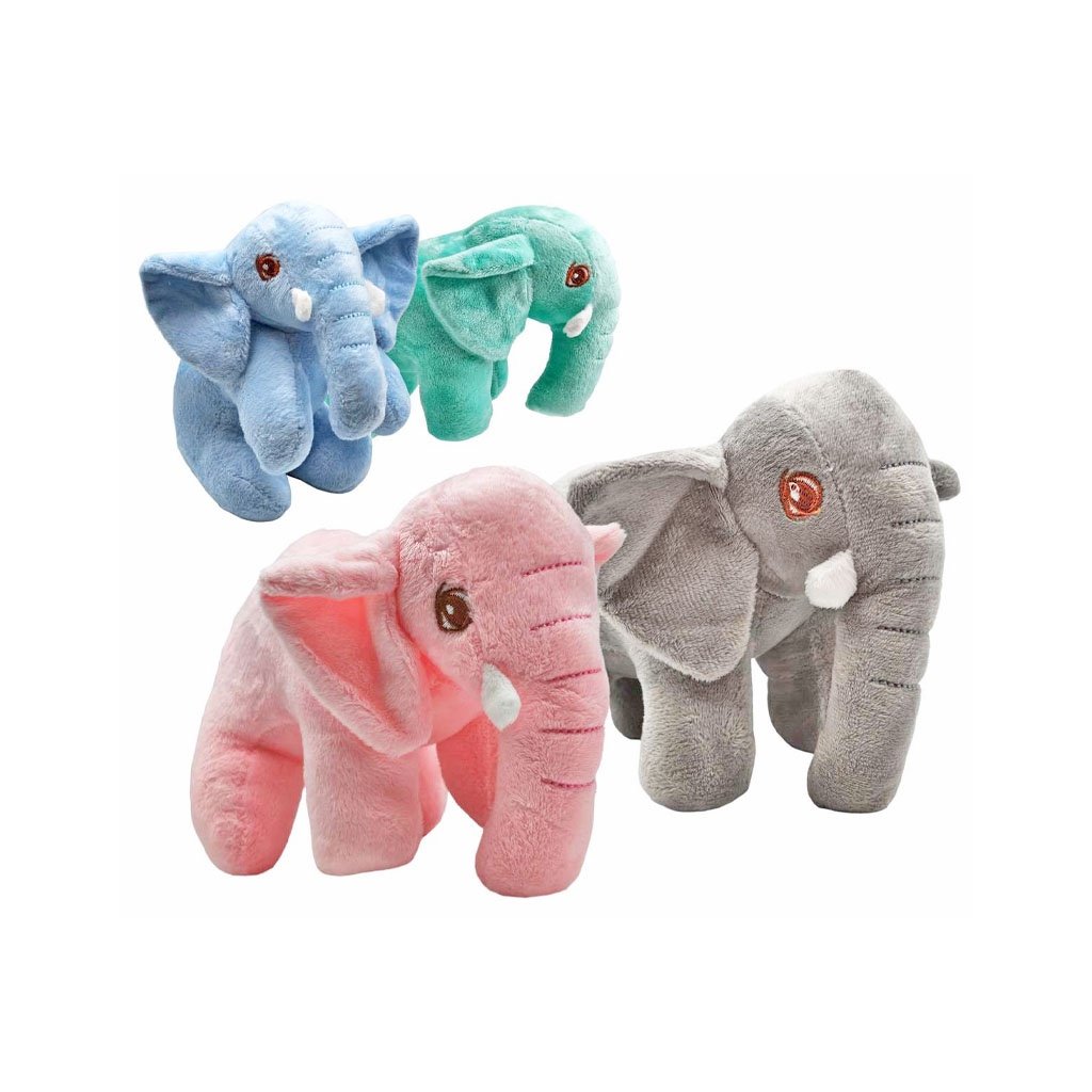 Plyšový 19cm stojaci sloník. Možnosť výberu zo štyroch farieb - sivý, ružový, modrý alebo zelený. Cena za kus.