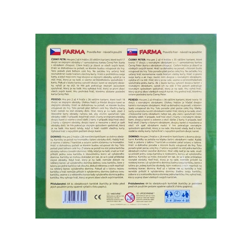 Súbor spoločenských hier pre malých aj veľkých. Typické hry, ktoré zabavajú už desaťročia a ktoré nikdy neomrzia. 1hra - Čierny Peter: Hra pre 2 až 4 hráčov s 35 väčšími kartičkami, ktoré tvoria 17 dvojíc a 1 samostatnú kartu Čierny Peter 2hra - Pexeso: Hra pre 2 až 4 hráčov s 36 väčšími kartami, ktoré tvoria 18 dvojíc s rovankými obrázkami 3hra - Domino: Hra pre 2 hráčov s 28 kartičkami s dvoma obrázkami.Dodatočné parametre