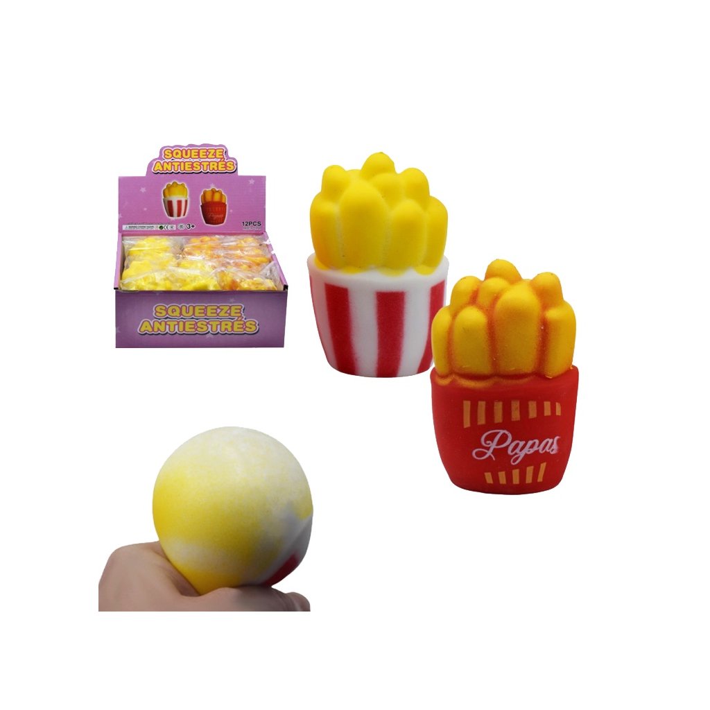 Antistresové 9cm stláčacie hranolky. Možnosť výberu z dvoch druhov - pásikavý alebo červený kelímok. Nevhodné pre deti do 3 rokov.Dodatočné parametre