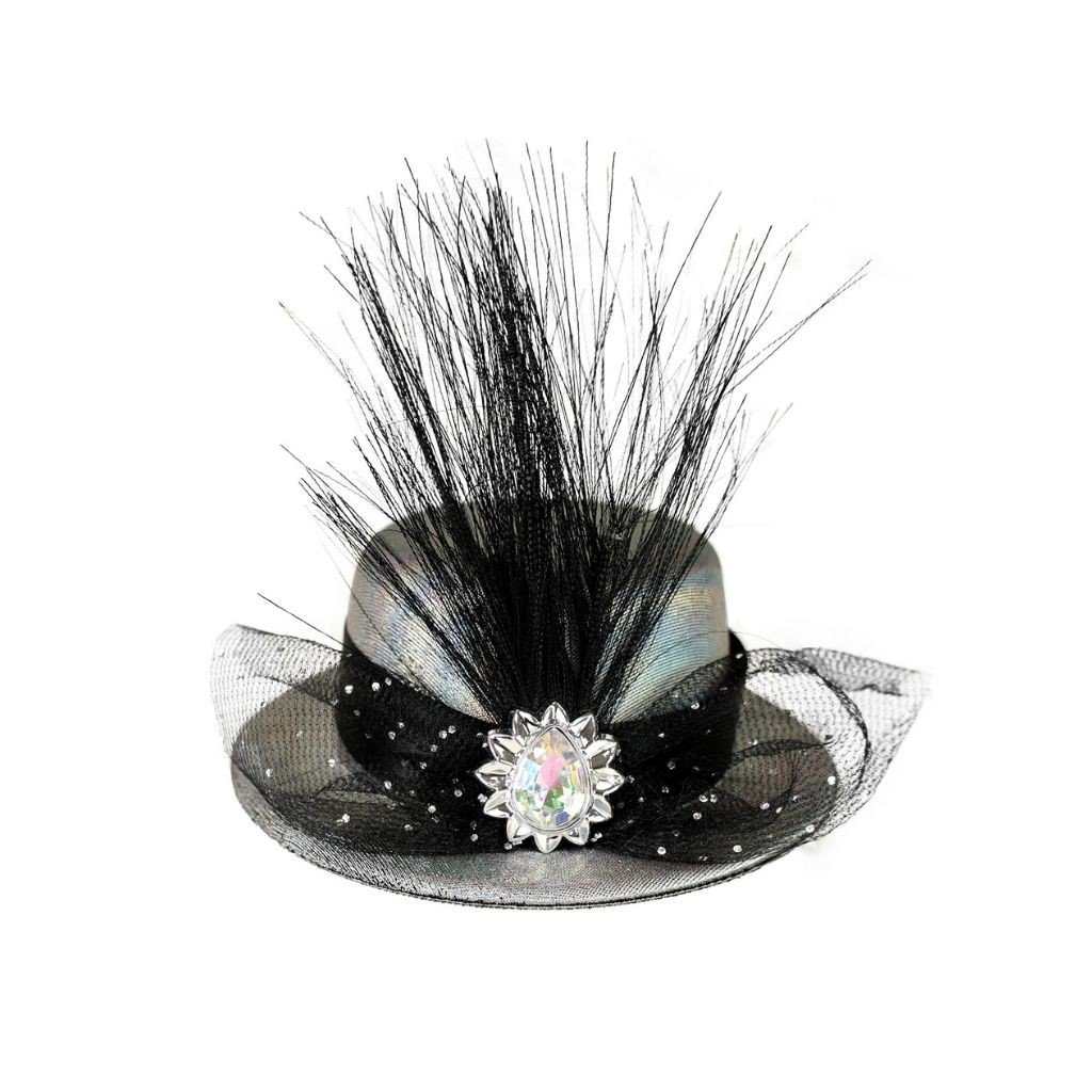 Mini klobúčik striebornej farby s čiernou stuhou, perím a tylom je doplnený šperkom. Pripevniť klobúčik k vlasom je možné pomocou dvoch sponiek. Je výrazným doplnkom ku karnevalovým a párty kostýmom.Dodatočné parametre
