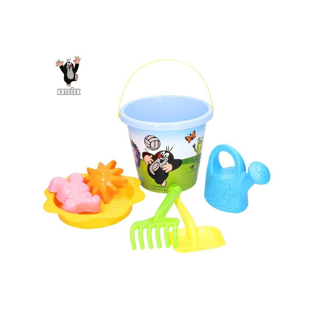 Detská sada na piesok Krtko v modrej farbe obsahuje vedierko s objemom 3,5 l, sitko, 2 formičky, lopatku, hrabličky a krhličku, ideálna na hru na pieskovisku, pláži alebo v záhrade, veselý motív Krtka poteší každé dieťa a spríjemní hru vonku, vyrobená z kvalitného a odolného plastu vhodného pre detské ruky, hra podporuje fantáziu, kreativitu a jemnú motoriku.Dodatočné parametre