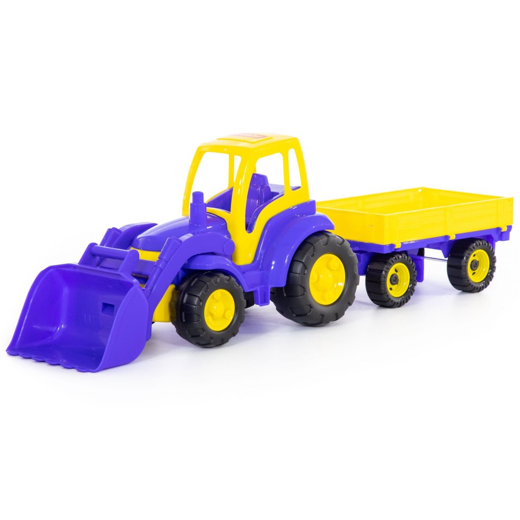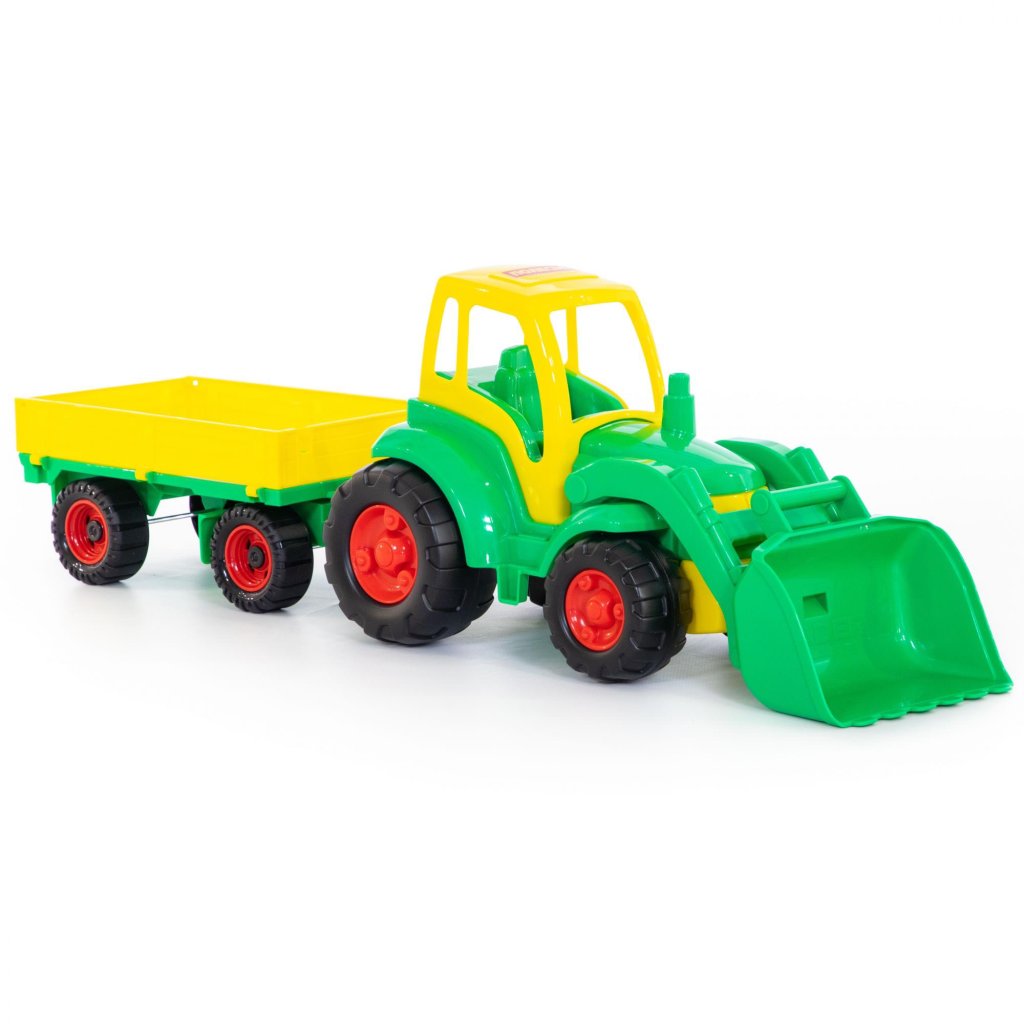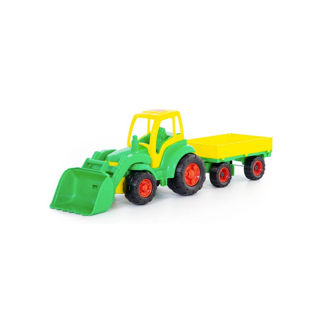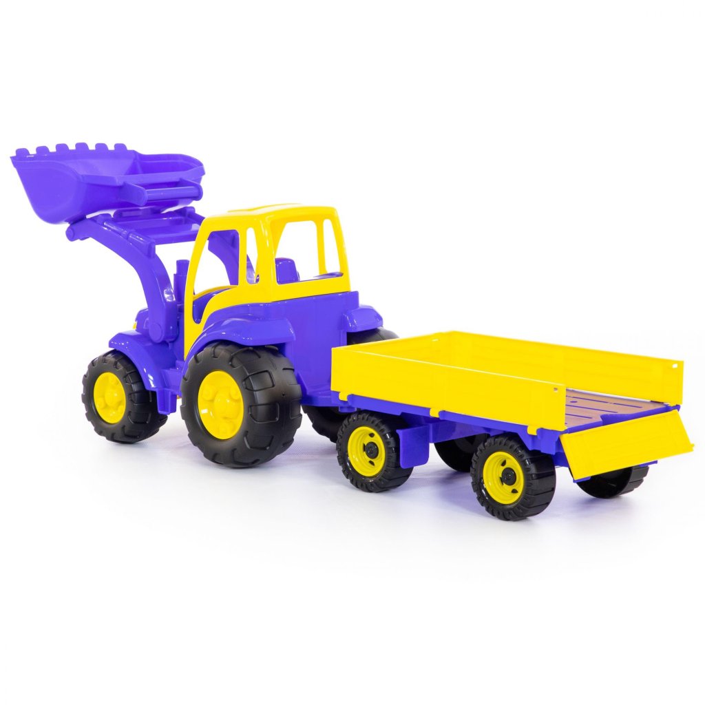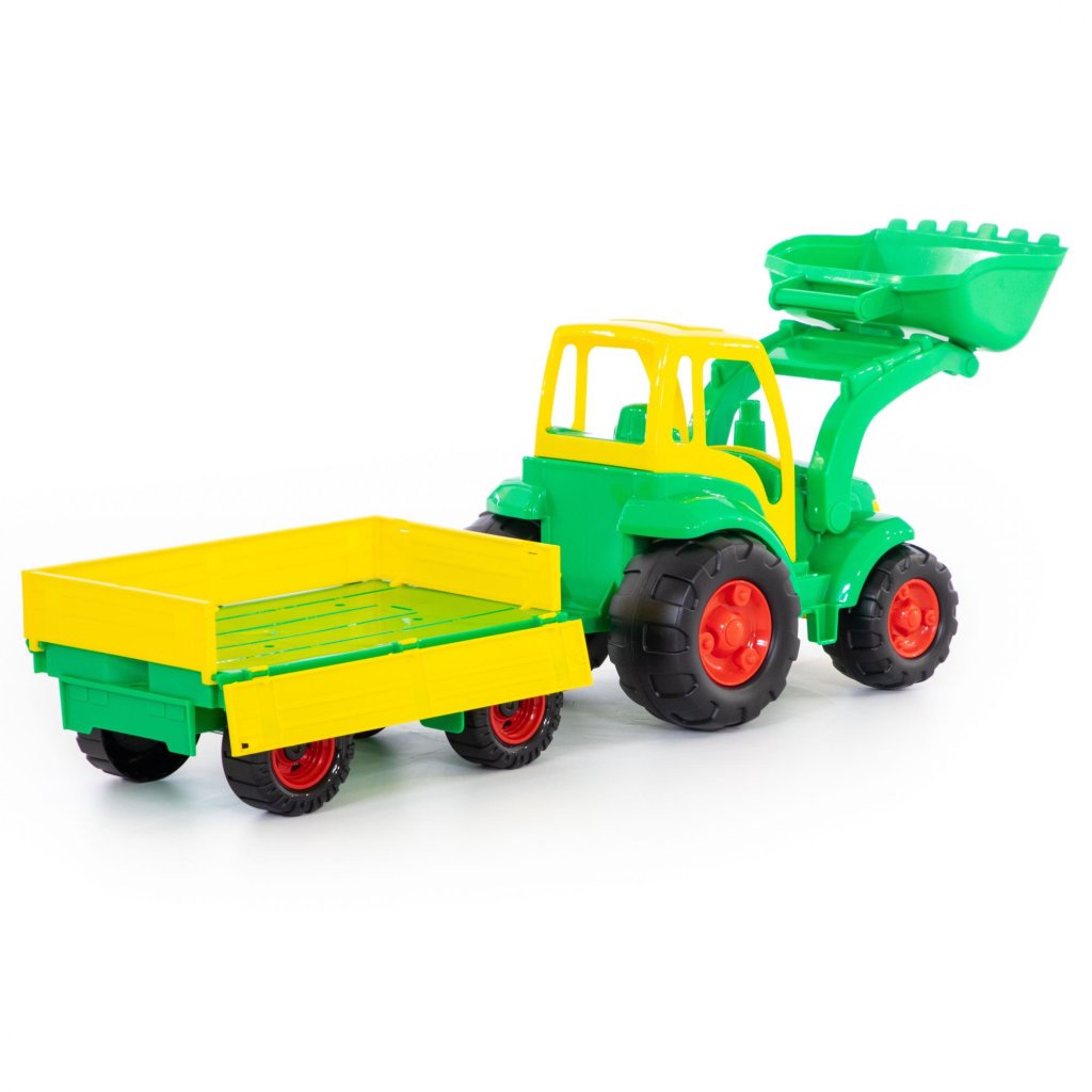 Plastový traktor s mechanicky pohyblivou radlicou s prívesom, bez pohonu, vhodný na hru do interiéru aj na piesok, certifikovaný pre deti od 1 roku veku. Balenie v sieťke.Dodatočné parametre