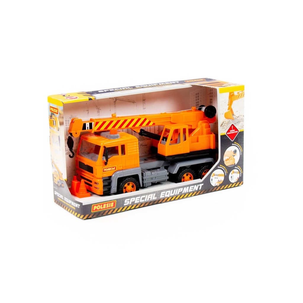Auto má realistický dizajn a detailnú konštrukciu: nechýbajú imitácie svetlometov a blikajúce majáky. Všetky stroje sú navyše vybavené inerciálnym mechanizmom.Žeriavový vozík je zaujímavým typom zariadenia. Hračka má pohyblivý otočný tanier a tiež výsuvný výložník s hákovým zavesením, ktoré je možné zdvíhať a spúšťať pomocou ručného mechanizmu. Dizajn žeriavu predpokladá prítomnosť troch párov kolies a ku hračke sú pribalené stavebné kužele, ktoré spestria a doplnia hru!