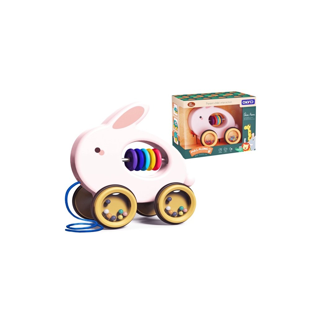 Potiahni zajačika za povrázok a sleduj ako pôjde za tebou hojdajúcim pohybom. V kolieskach hŕkajú farebné guľôčky a v brušku môžeš krútiť s farebnými krúžkami. Výška - 15,5 cmDodatočné parametre