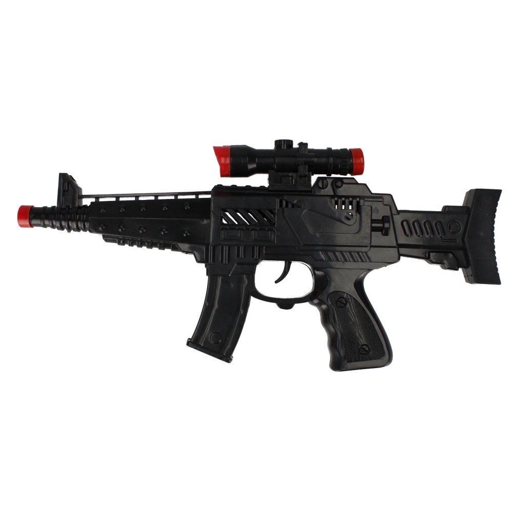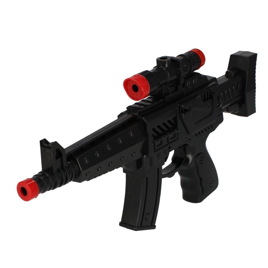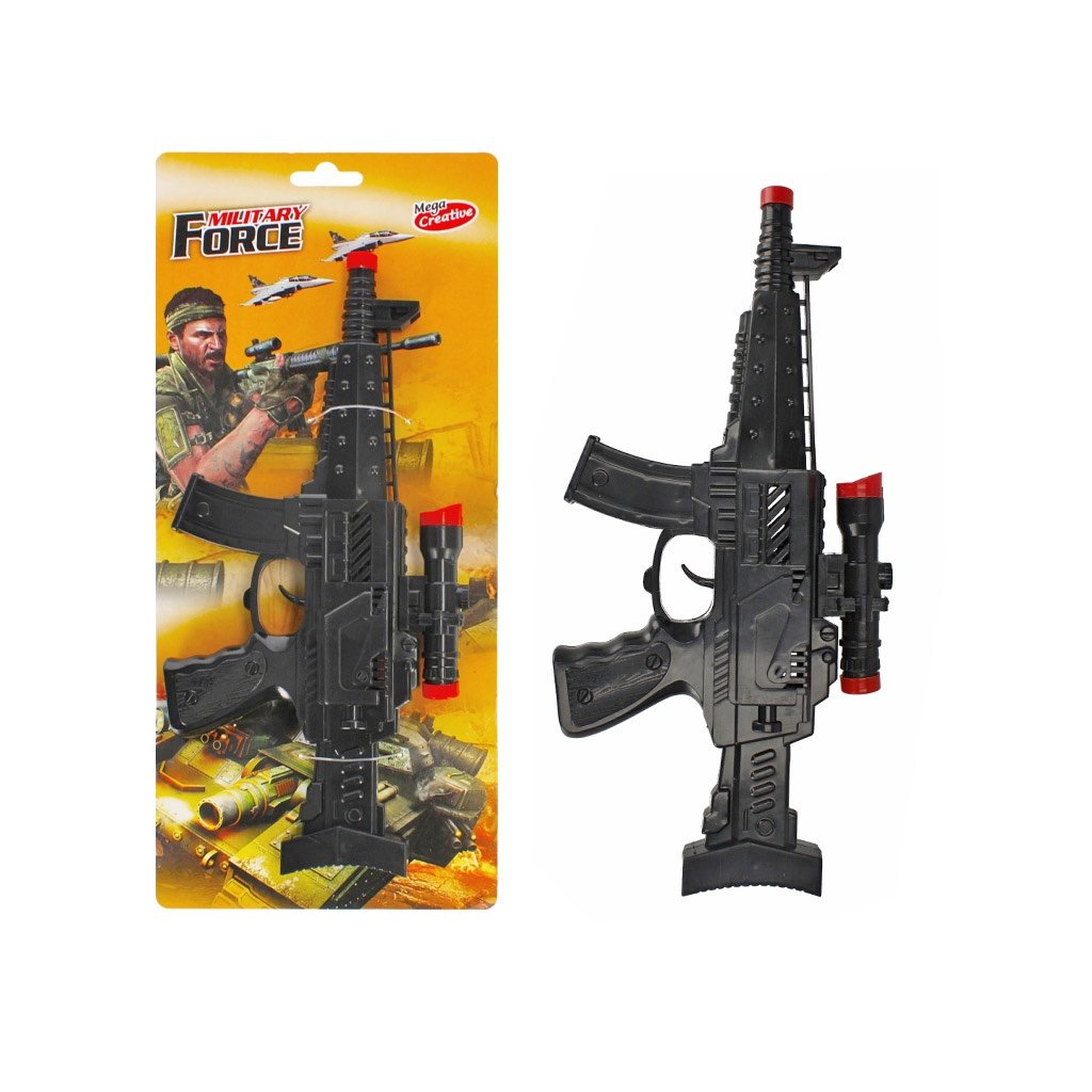 Zvuková puška, ktorá pri stlačení vydáva zvuk výstrelu. Rozmery hračky sú 31x14x4cm. Hračka je určená pre deti vo veku 3+.Dodatočné parametre