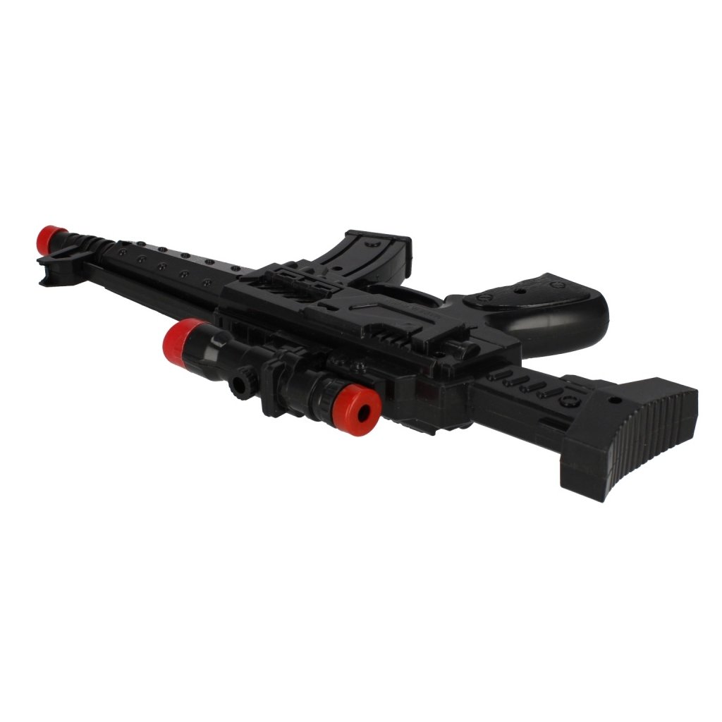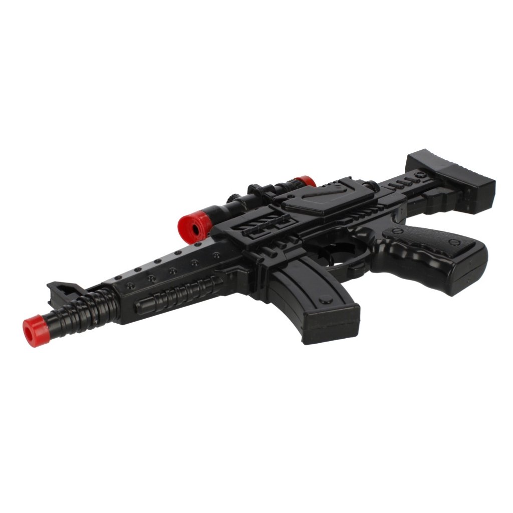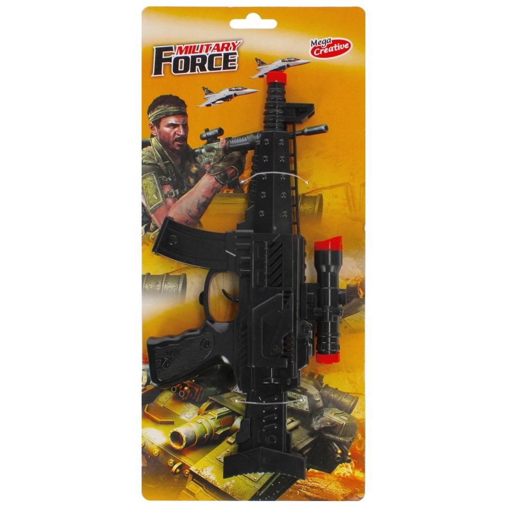 Zvuková puška, ktorá pri stlačení vydáva zvuk výstrelu. Rozmery hračky sú 31x14x4cm. Hračka je určená pre deti vo veku 3+.Dodatočné parametre